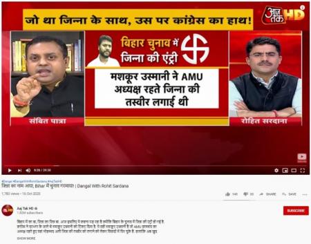 Aaj Tak ran broadcasts suggesting that the Congress will seek votes on the basis of ‘Jinnah’s genie’ while issues of development and corruption will take a backseat. Anchor Rohit Sardana in his daily show ‘Dangal’ invited several panellists to discuss Usmani’s candidature. The channel claimed multiple times (1:24 minutes and 6:20 minutes) that in 2018 Usmani installed a portrait of Pakistan’s founder Muhammad Ali Jinnah at AMU.