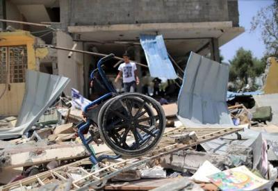 Only a wheelchair remains after the Israeli airstrike killed two people in a disabled centre.