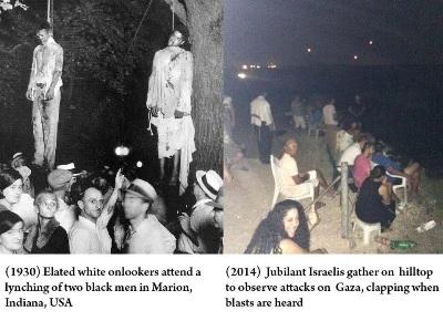 Allan Sorenson, a Middle Eastern correspondent for the Danish newspaper Kristeligt Dagblad, took the image on Wednesday in Sderot, a city about two kilometers from Gaza. The people who had gathered on the hilltop, cheered and clapped every time they observed a hit on Gaza from the Israeli missiles. The iconic image of the lynching of two young African-Americans in 1930 with cheering white onlookers juxtaposed with the Sderot images has been doing the rounds of twitter and also on other social media.