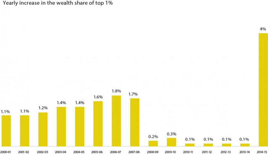 According to the recently released Credit Suisse Global Wealth Report (2015), the top 1% of India’s population, own more than half of the country’s wealth. This is the first time in the history of independent India, this has happened. The top 1%’s share in the total wealth in 2015 is 53%, up from the 49% in the year 2014, an increase of 4%. In Modi’s first year as prime minister, the country has registered the highest growth of inequality in the last 15 years.