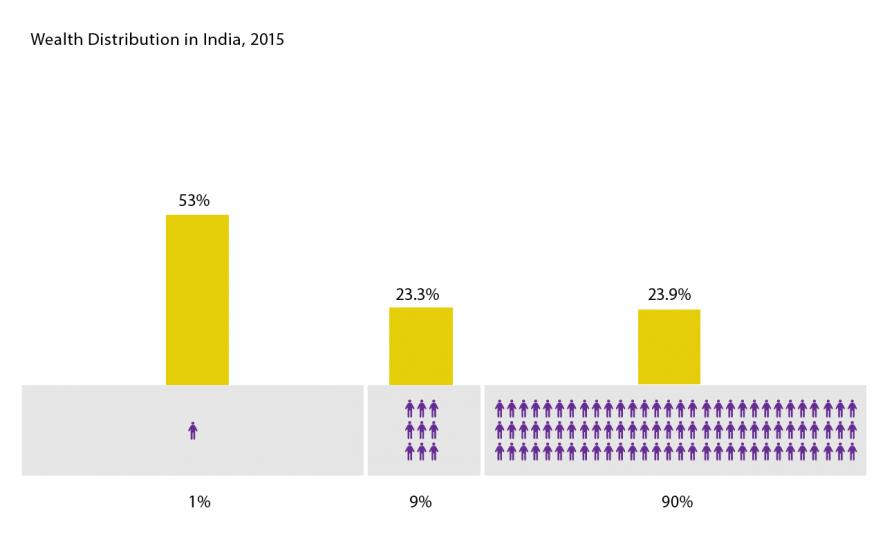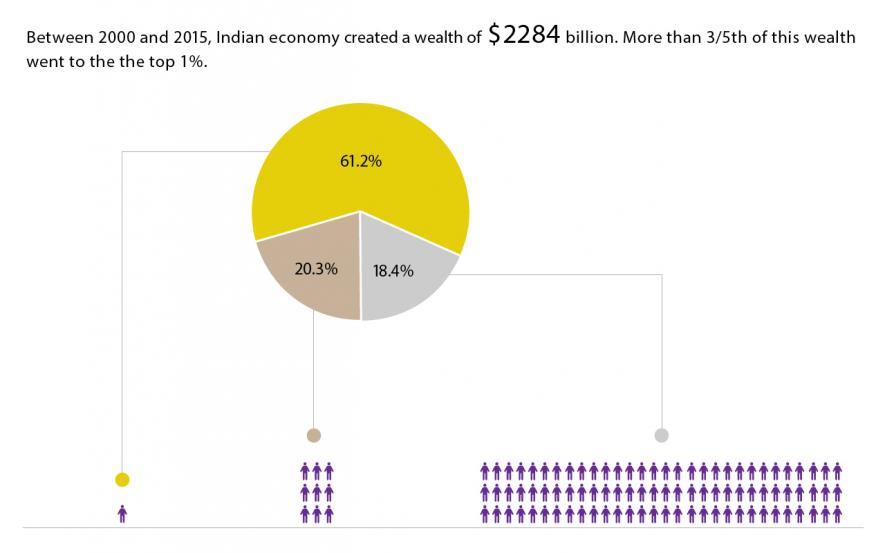 A total wealth of $ 2.3 trillion was created in the Indian economy between the years 2000 and 2015. Out of this newly created wealth, the top 1% appropriated 61% ($1.4 trillion), while the next 9% got 21% share ($ 0.5 trillion). The bottom 90% of the population was left with only 18% ($0.4 trillion) of this new wealth.