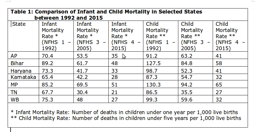 The first set of data that we have are of the trends in Infant Mortality Rate (number of deaths of children below one year for every 1,000 live births) and Child Mortality Rate (number of deaths of children below five years for every 1,000 live births). Infant and child death rates are acknowledged as important indicators of overall development and not just of health services, as mortality among children is very sensitive to a variety of social and economic determinants. Table 1 provides the comparison.