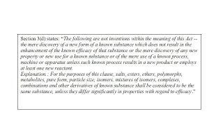 The ordinance had to be ratified by Parliament within 6 months. If the Indian Parliament had done so, we would not have been discussing the recent judgment by the Supreme Court of India against the claim of a patent on an important anti-cancer drug (Imatinib), manufactured by the Swiss Multinational, Novartis. Instead of ratifying the ordinance the Indian Parliament introduced, in 2005, several measures to safeguard continued production of new medicines by Indian companies, even in cases when in other parts of the world MNCs had patented these drugs and held a monopoly over their production and sales. One of the important clauses introduced by the Indian Parliament was a new section – section 3(d). This section lies at the heart of the litigation that Novartis has been pursuing for seven years, and it is this section which has been instrumental in the refusal of the patent by the Supreme Court of India.